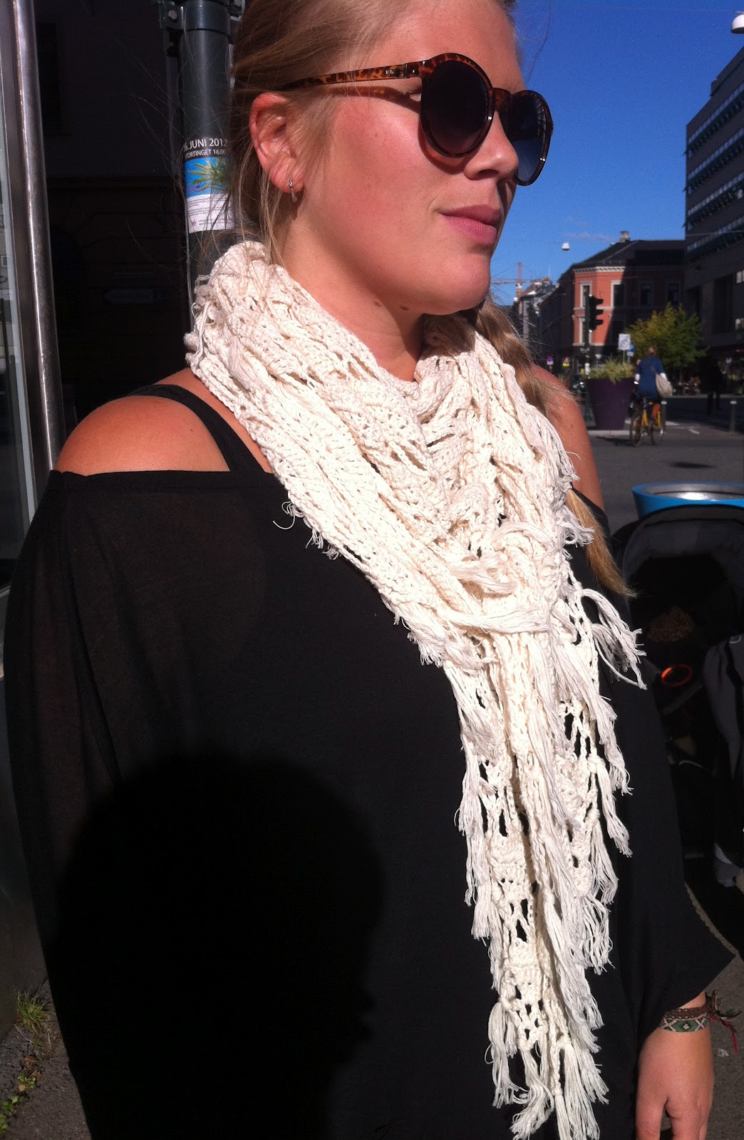 Før sommeren så jeg så mange heklede bomullsjal/skjerf (jeg kaller det nå skjerf, siden jeg bruker det som det) til salgs over alt, og fikk lyst til å lage et selv.